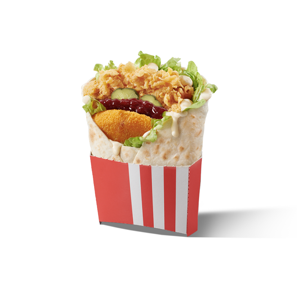 Served on a warm tortilla, this flavor adventure combines juicy chicken fillet, French Reblochon Cheese Patty, cranberry jam, crispy onions, pickles, iceberg lettuce and mayonnaise.