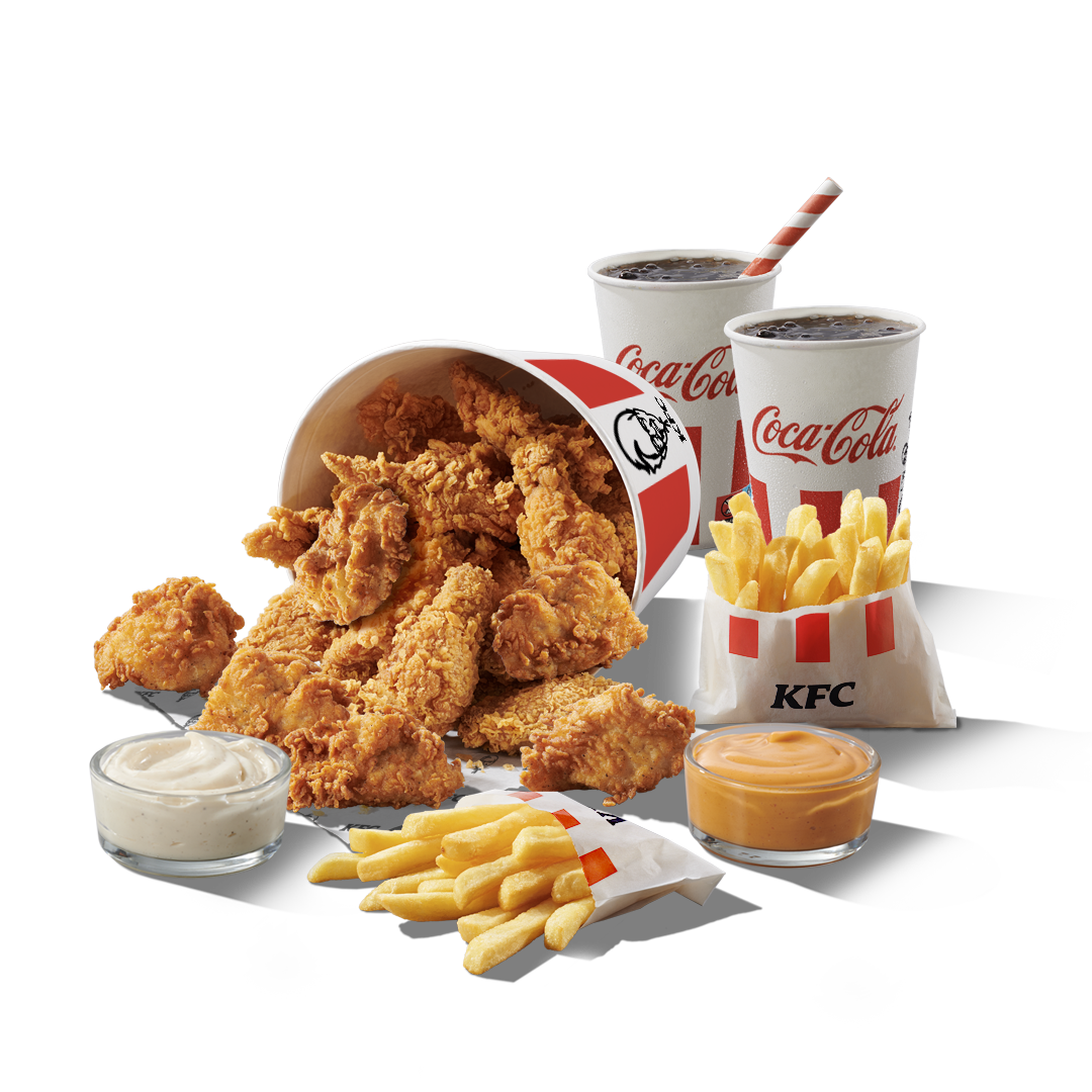 10 KFC Nuggets, 6 chicken strips (extra chrispy recipe), 2 S drinks, 2 S fries, 2 dips.