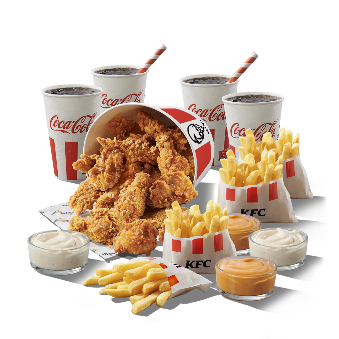 Winter Bucket for 4 12 KFC Nuggets, 8 chicken strips (original or extra chrispy recipe), 8 hot wings, 4 S drinks, 4 S fries, 4 dips. CONTAINS 12 pcs KFC nuggets 8 pcs Chicken Strips 8 pcs Hot Wings 4 pcs Small fries 4 pcs Dips DRINK Coca-Cola Coca-Cola Zero Sprite Fanta